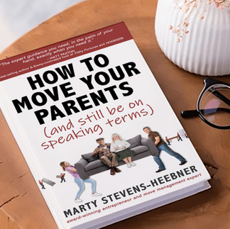 "What an amazing resource this is! I wish I had it when I needed to clean out my mother’s apartment after moving her to my house - and when my family moved from our house of 30 years to a new home. All of this information in one place is incredible! So many tips inside each chapter and checklists to help you every step of the process. Helping your parents move or downsize can often feel daunting, leaving you overwhelmed and unsure where to begin. Thankfully, Marty-Stevens Heebner’s insightful book, ‘How to Move Your Parents (and still be on speaking terms)’, is here to transform that anxiety into empowerment. In each chapter, you’ll find practical advice, helpful Moving Moments, Inside Scoop, Smart Move Tips, and meticulously crafted worksheets. With compassion and expertise, Marty shares this valuable information while also recognizing the emotional journey that often comes with the challenges of a physical move. If you’re facing the challenge of helping your parents with a move and wondering, “How am I ever going to manage this?!” let ‘How to Move Your Parents (and still be on speaking terms)’ be your trusted companion on this journey. It’s the guidance you need to navigate this experience without losing your mind!” Rosanne Corcoran - Podcast Host, Daughterhood